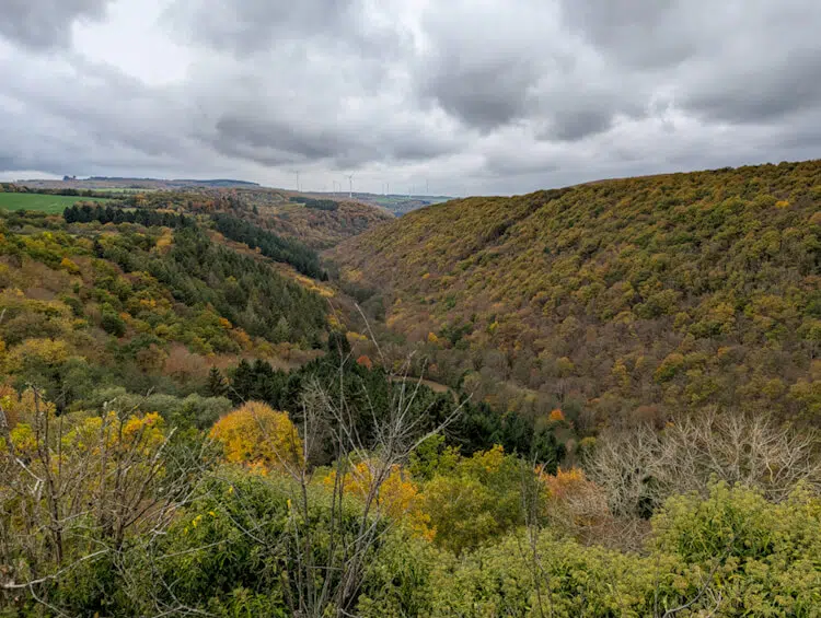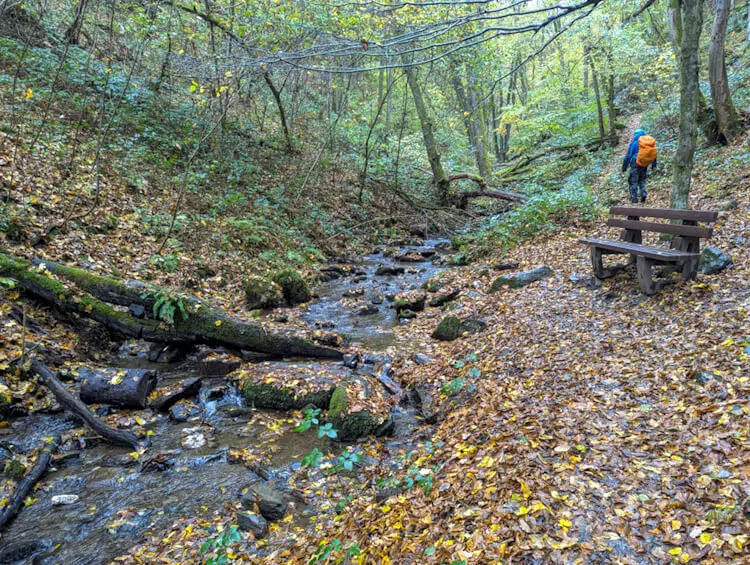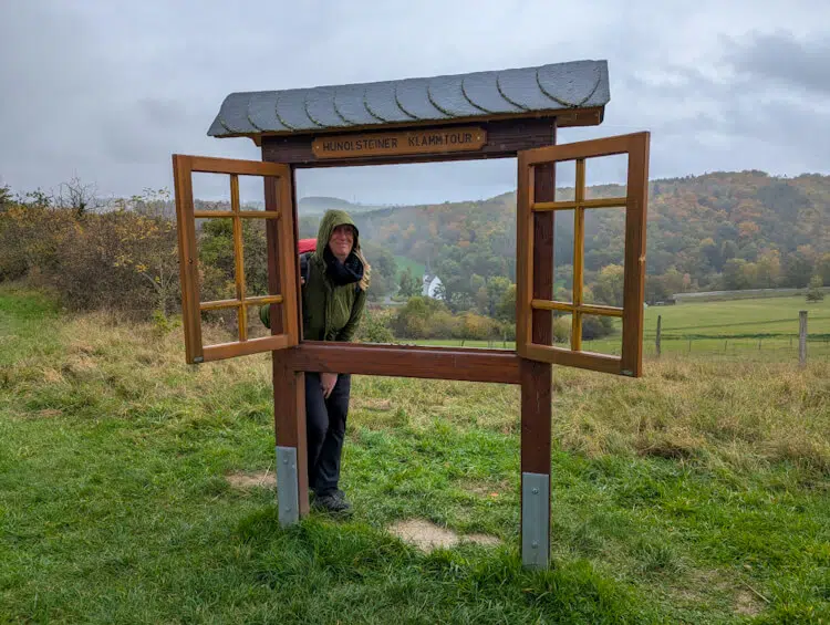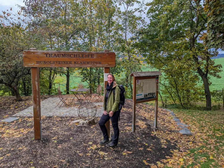 Das schöne Herbstwetter der letzten Tage macht heute Pause – dicke Wolken hängen über dem Hunsrück. Trotzdem schnüren wir die Wanderschuhe und machen uns auf den Weg zur Traumschleife „Hunolsteiner Klammtour“, die 2025 den 3. Platz bei „Deutschlands schönster Wanderweg“ belegte.