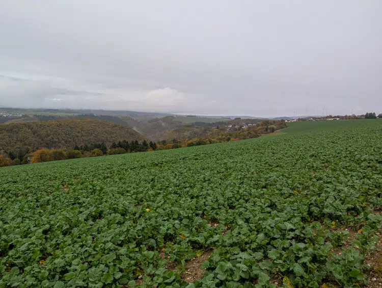 Nach der Schänke führt uns der Weg zunächst talabwärts, hinein in ein ruhiges Eichenwäldchen. Ein schmaler Pfad bringt uns zum tiefsten Punkt der Runde – und von dort aus geht es ordentlich bergauf. Gefühlt sammeln wir hier alle Höhenmeter am Stück. Oben angekommen, verläuft der Rückweg über eine lange, aussichtsreiche Gerade zurück zum Bauernhofcafé Hunolsteiner Hof – das glücklicherweise noch geöffnet hat.