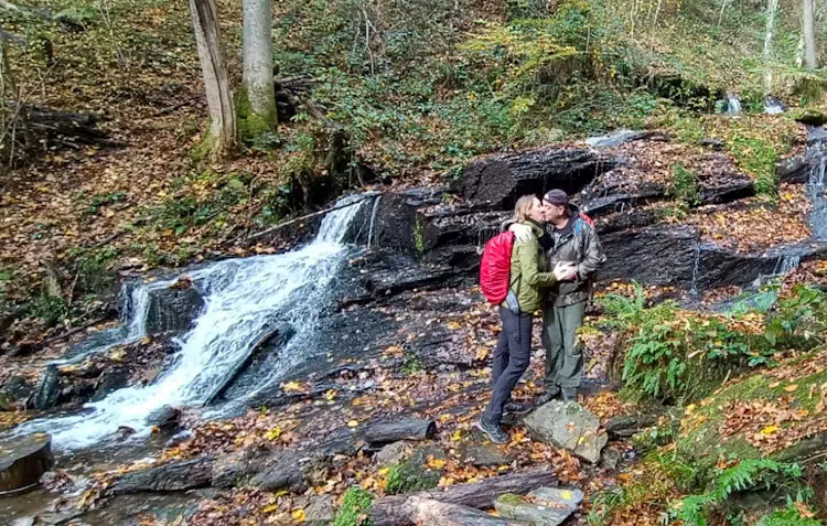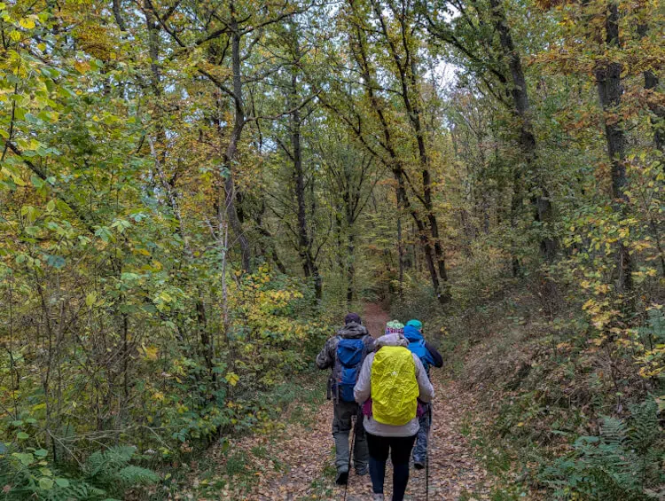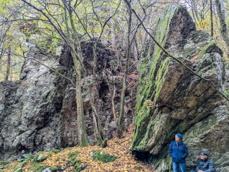 Kurze Zeit später erreichen wir den markanten Kopusfelsen – eine wuchtige Felsformation mit großem Überhang. Wie einige andere Wandernde nutzen wir den natürlichen Unterschlupf als Regenpause. Während wir unter dem Fels stehen und den Regen abwarten, bläst der Wind so heftig, dass trotz Nässe unzählige bunte Blätter durch die Luft wirbeln. Ein faszinierender Moment – fast, als würde der Wald lebendig werden. Fototauglich ist dieses Szenario leider nicht… 🙂