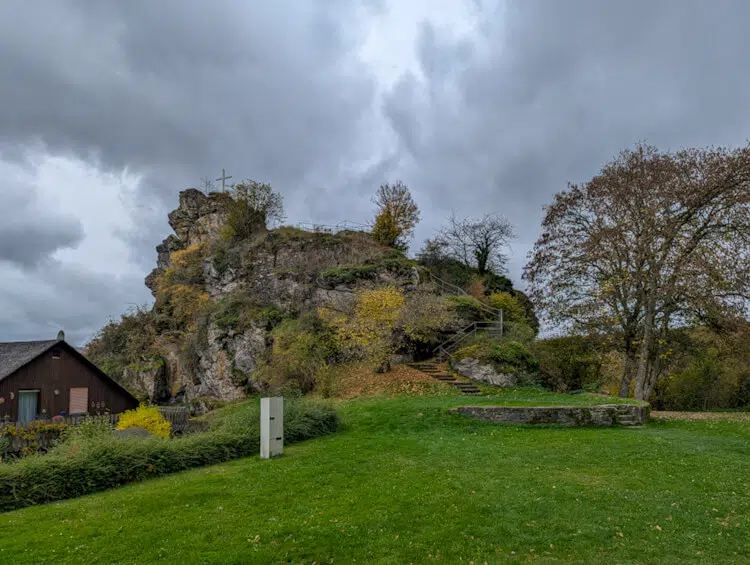 Begleitet von großen Quarzitfelsen erreichen wir bereits nach wenigen Minuten die Burgruine Hunolstein. Viel ist von der einstigen Höhenburg nicht mehr erhalten, aber ein markanter Quarzitblock mit eingelassenen Stufen führt hinauf zum Gipfelkreuz. Der kurze Abstecher lohnt sich – oben wartet ein beeindruckender Panoramablick über die Hunsrückhöhen.