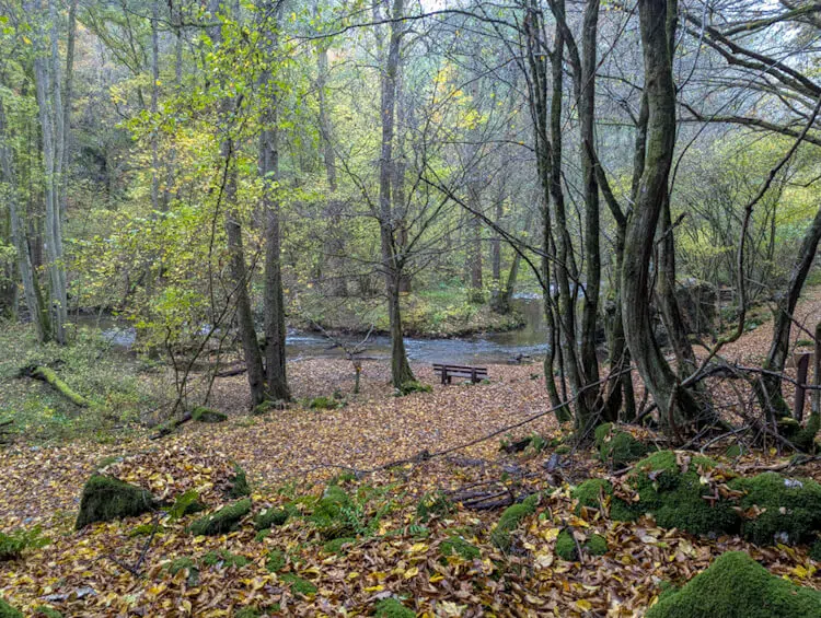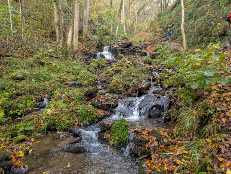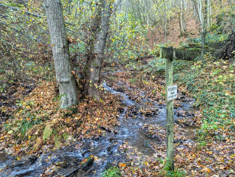 Im kräftigen Regen folgen wir schmalen Waldpfaden hinab zur Reinhardsmühle und weiter in das stille Tal der Drohn. Der gleichnamige Bach begleitet uns zur Linken, während moosbewachsene Felsen und alter Baumbestand eine fast mystische Stimmung erzeugen. Die Drohn selbst ist ein kleiner Nebenfluss der Mosel – nur 36 Kilometer lang, entspringt in Morbach und mündet bei Neumagen-Dhron in den großen Strom.