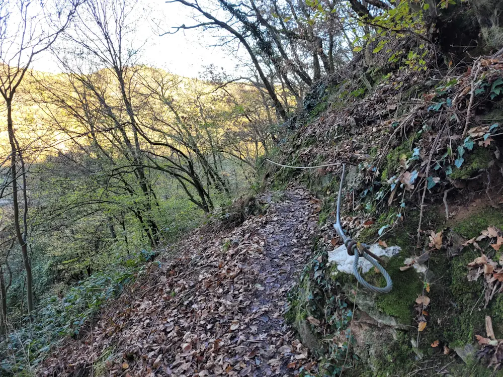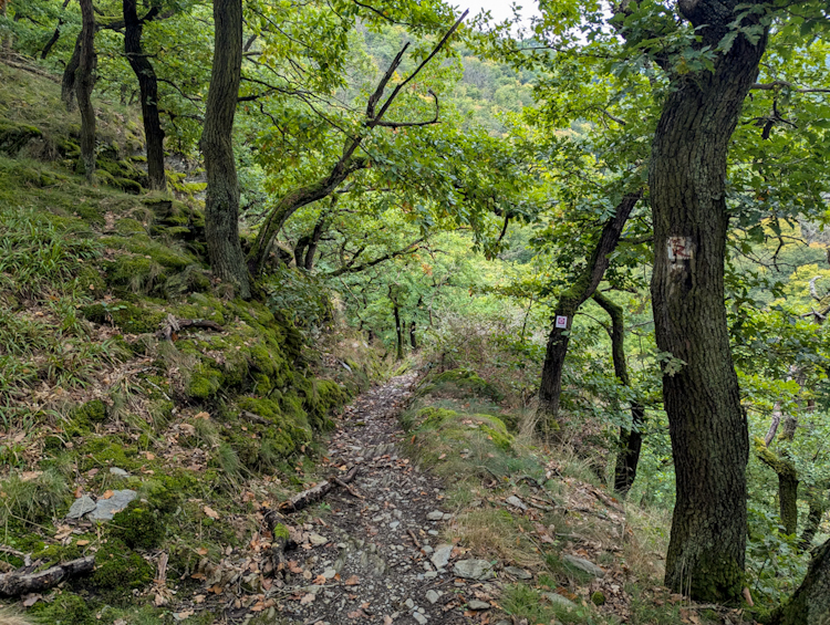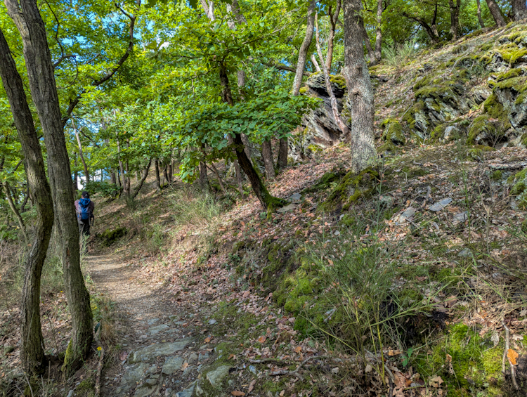 Im Tal wird es spürbar kühler und schattiger. Kurz darauf weist ein Wegweiser auf den schmalen Eselspfad hin, dem der Rheinburgenweg nun folgt. Der urige Pfad führt durch ein knorriges Eichenwäldchen steil bergauf – ein echter Kontrast zur offenen Landschaft davor. Später säumen Felsen den Weg und sorgen für alpines Flair.