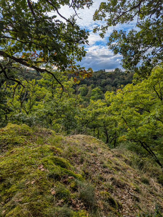 Der darauffolgende Anstieg fühlt sich stellenweise fast wie ein Dschungel an – dichter Wald, knorrige Bäume, moosbedeckte Steine. Kurz darauf öffnet sich die Landschaft zu Streuobstwiesen, ideal für eine kleine Verschnaufpause. Entlang der Hangkante laden immer wieder schöne Rastplätze mit Aussicht zum Innehalten ein.