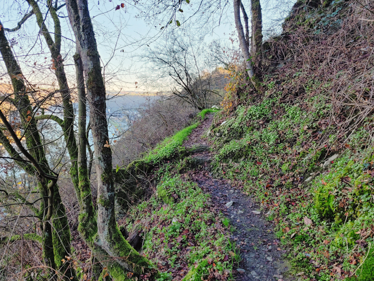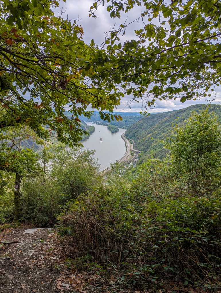 Ein weiterer steiler Anstieg bringt dich auf einem alpinen Pfad durch den Hangwald zum höchsten Punkt dieses Abschnitts. Dort wartet eine Bank mit beeindruckender Aussicht über das Rheintal, hoch über dem Ort Hirzenach – ein idealer Moment zum Durchatmen. Danach wird es erneut abenteuerlich: Der Rheinburgenweg führt über einen steilen, teils gesicherten Pfad bergab, bis zu einer markanten Felsnase mit grandiosem Blick.