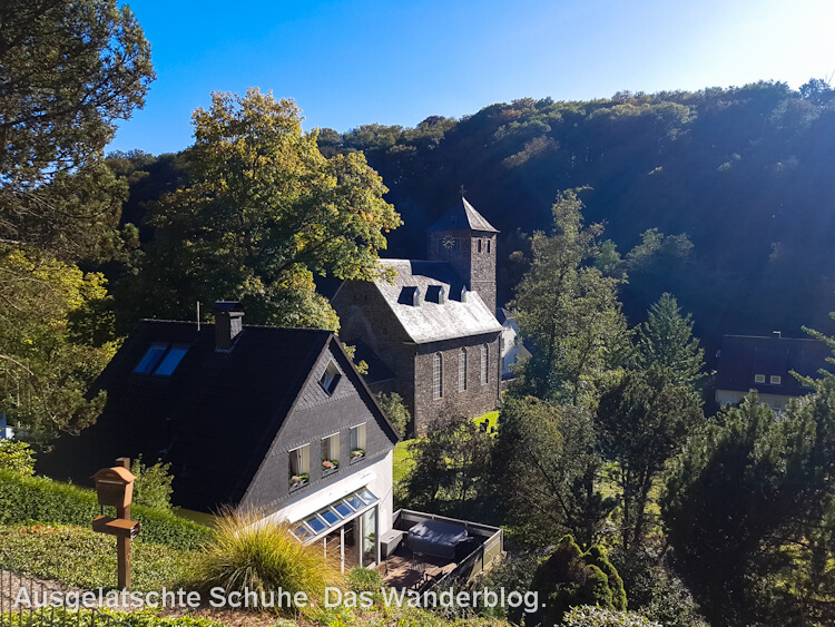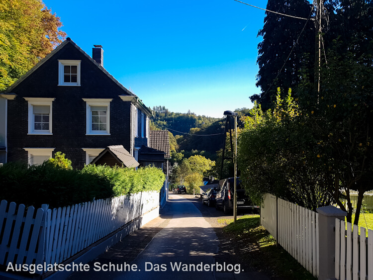 So lassen wir die Brücke hinter uns – ohne ein Foto zu schießen – und gelangen kurz darauf an die Ausläufer von Unterburg. Der Waldweg verwandelt sich in Asphalt und Zivilisation taucht auf. Schloss Burg selbst ignorieren wir, weil wir beide schon öfter oben gewesen sind. Außerdem sind wir spät dran und wollen noch zur Talsperre. Ein bisschen Hintergrundwissen zur Burg verbloggte ich übrigens einst hier. Unterhalb der Burg riecht es so krass nach ‚Bergischen Waffeln‘, dass ich kaum noch an mich halten kann. 😀 Doch unser Tacho zeigt erst 7 km. Ich reiße mich also zusammen und schweren Herzens gehen wir weiter.