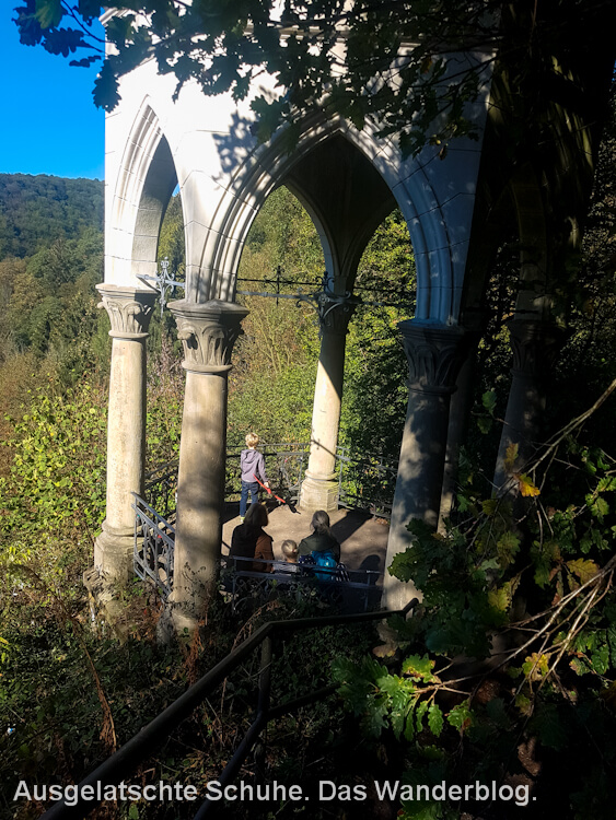 Ich lag zuvor knapp sechs Wochen flach, wegen einer Allergie auf ein Antibiotikum. So stelle ich fest, dass Höhenmeter eine Herausforderung für mich darstellen. Wir bezwingen die Steigung langsam und erreichen oben den Müngstener Diederichstempel. Der Diederichstempel ist eine Aussichtsplattform, die 1901 von August Diederichs (einem wohlhabenden Remscheider) gestiftet wurde. Und der Aufstieg hat sich gelohnt: Von hier hat man einen tollen Blick auf die Eisenbahnbrücke. Es existiert noch ein zweiter Tempel in Burg, welchen wir später nur von Weitem sehen.