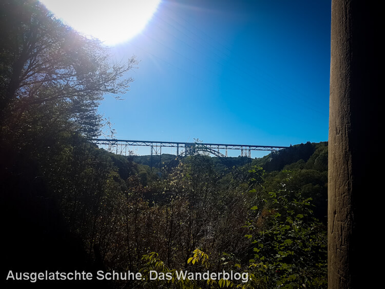 Der Route führt uns auf Waldwegen in Richtung Schloss. Die Wupper schlängelt sich durchs Tal und ist unser ständiger Begleiter. Schließlich stehen wir direkt unter der höchsten Eisenbahnbrücke Deutschlands. Die Müngstener Brücke ist 465 m lang und ca. 205 m ü. NN hoch. Einerseits wirkt es imposant, andererseits jedoch wenig spannend. Warum? An der Überführung wird gebaut! Um uns herum ist alles sorgfältig verkleidet und es gibt – außer Bauplanen – rein gar nichts zu sehen …