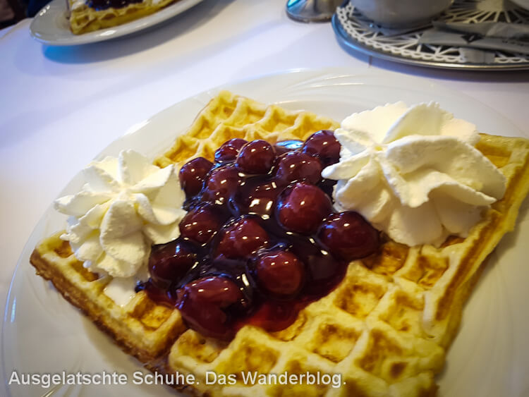 Selbstverständlich finde ich gegenüber noch ein anderes, hübsches Café, in dem wir ein „Wanderergedeck“, also eine Bergische Waffel und Kaffee*, bestellen können. Ich lasse mich doch nicht um das süße Gebäck bringen … 😉